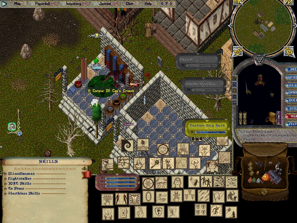 After I took three crystals from them, they finally managed to save up ten, and set up two walls to protect themselves from me while they exchanged the bag ball from one to another. Cap'n took the power crystals through the moongate, and left Justin Credible alone... He fought bravely, he fought boldly, he was as fierce as I have ever seen one man in battle, unfortunately, he wasn't fighting one man, but two paragons. Once he realized it, it was too late... his body dropped to the ground and my eyes lit up! I quickly grabbed what I could, but got the attention of a minion. Fortunately, Cap'n Crunch came back to check on his friends progress, and mourned his death but a moment before the minion turned his wrath on Cap'n. Cap'n lead the minion away for me, allowing me to finish looting.